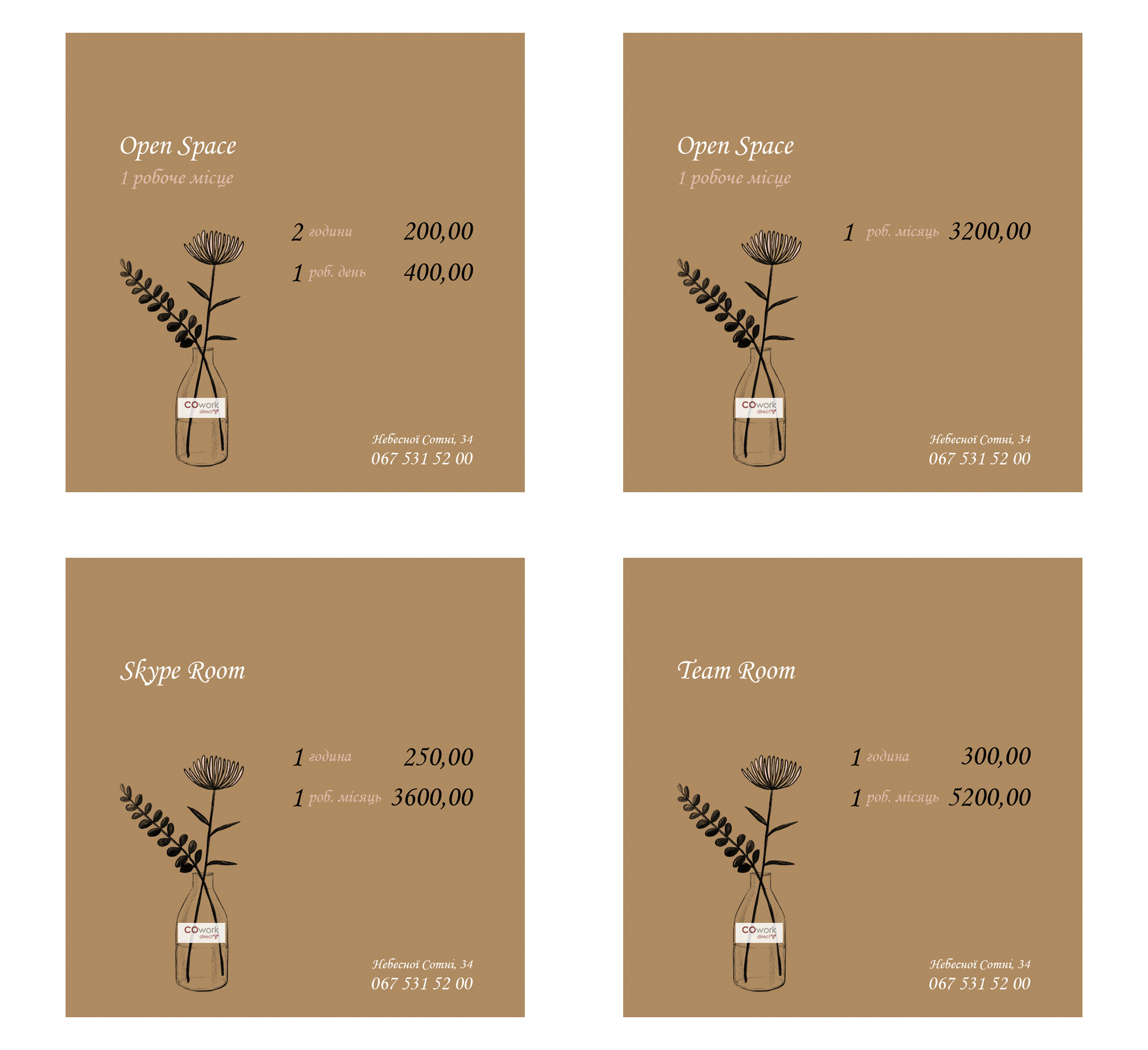 До вартості послуг входить: робоче місце з обладнанням; можливість користуватися міні-кухнею; камера схову; металевий сейф; інтернет; комунальні послуги; клінінг; цілодобова охорона.
