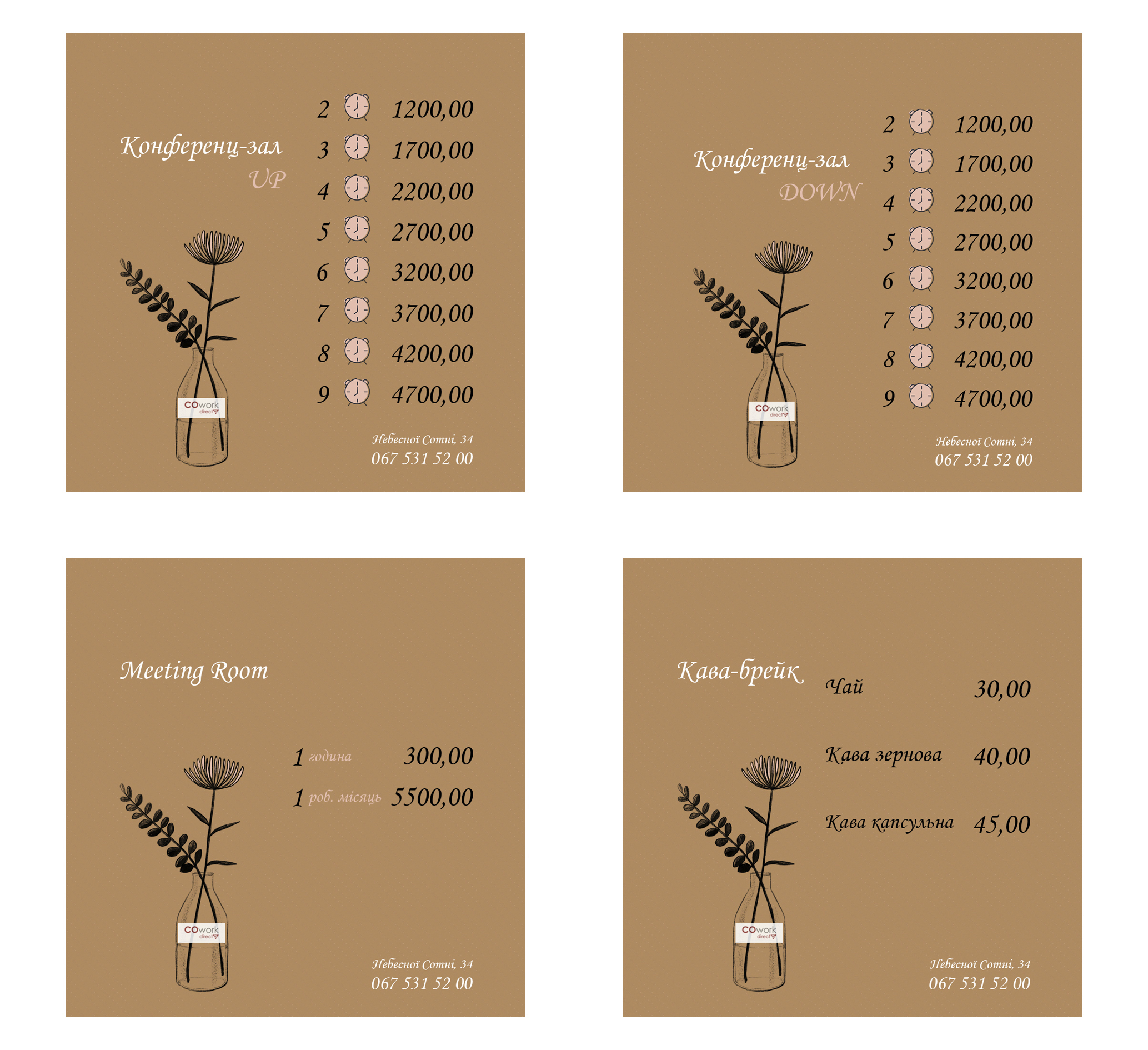 До вартості послуг входить: робоче місце з обладнанням; можливість користуватися міні-кухнею; камера схову; металевий сейф; інтернет; комунальні послуги; клінінг; цілодобова охорона.